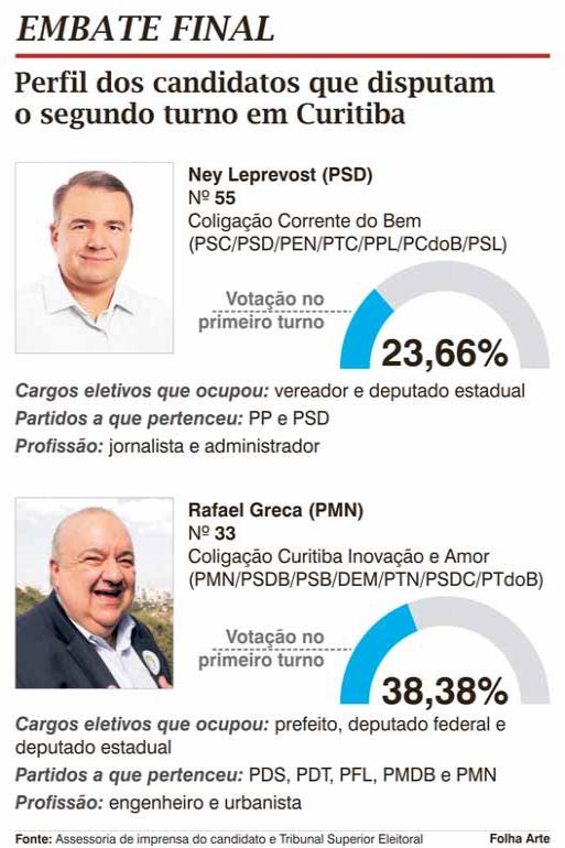 Enquanto o ex-ministro do Turismo tenta voltar ao cargo depois de 20 anos [ele chefiou o Palácio 29 de Março entre 1993 e 1996), o deputado estadual busca sua primeira vitória no Executivo. Os dois desbancaram, além de Fruet, outros cinco candidatos: Maria Victoria (PP); Requião Filho (PMDB); Tadeu Veneri (PT); Ademar Pereira (Pros) e Xênia Mello (PSOL). Na primeira etapa da disputa, Greca conseguiu a maioria dos votos - 356.539 (38,38%), contra 219.727 (23,66%) do político do PSD.