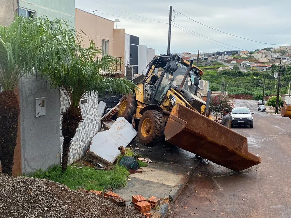Retroescavadeira desgovernada derruba muro de casas e atinge um carro